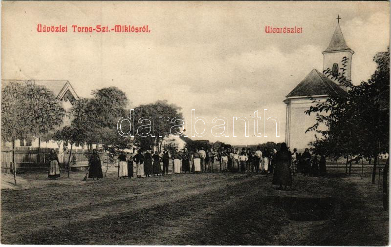 Beschreibung: 1914 Tarnaszentmiklós, Tarna-Szt.-Miklós (Heves); utca, Római katolikus templom