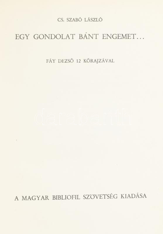 Cs. Szabó László: Egy gondolat bánt engemet... Fáy Dezső 12 kőrajzával. (Bp., 1936), Magyar Bibliofil Szövetség, 57+(1) p. Névre szóló példány (,,Ez a példány készült Hirsch Albert, a Magyar Bibliofil Szövetség rendes tagja számára"). Kiadói kartonált papírkötés.
