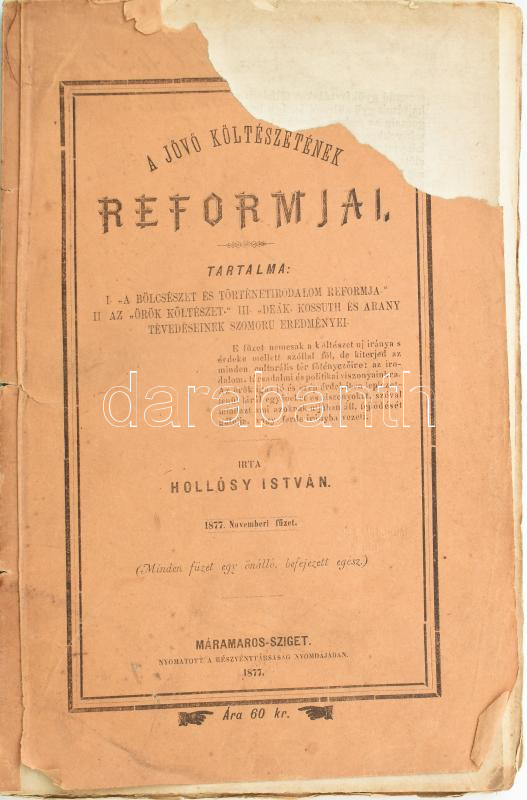 Hollosy István: A jövő költészetének redormjai. Máramaros-sziget. 1877. Részvénytársaság nyomdája. 66p. Kiadói papírborítóval, mely kissé hiányos DEDIKÁLT, mely nagyrészt a hiányzó borító részen volt