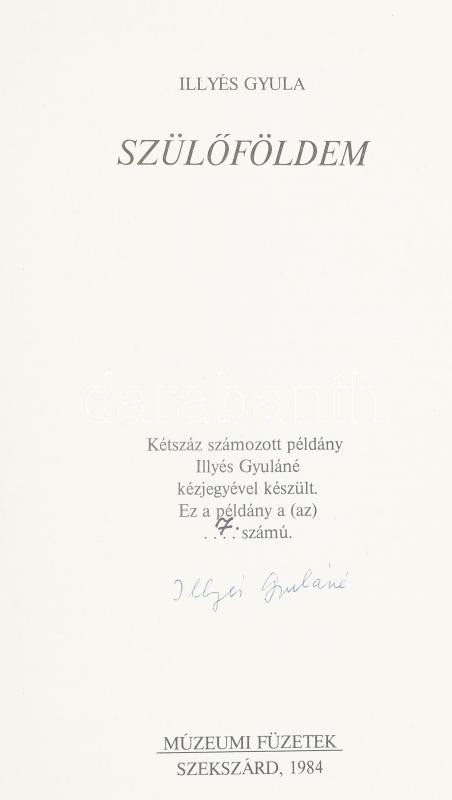 Illyés Gyula: Szülőföldem. Vál., szerk., az előszót írta: Vadas Ferenc. Múzeumi Füzetek. Szekszárd, 1984, Dr. Vadas Ferenc (Szekszárdi Nyomda). Kiadói papírkötés, a borítón némi kopással. Számozott (7./200), Illyés Gyuláné Kozmutza Flóra (1905-1995) által aláírt példány.