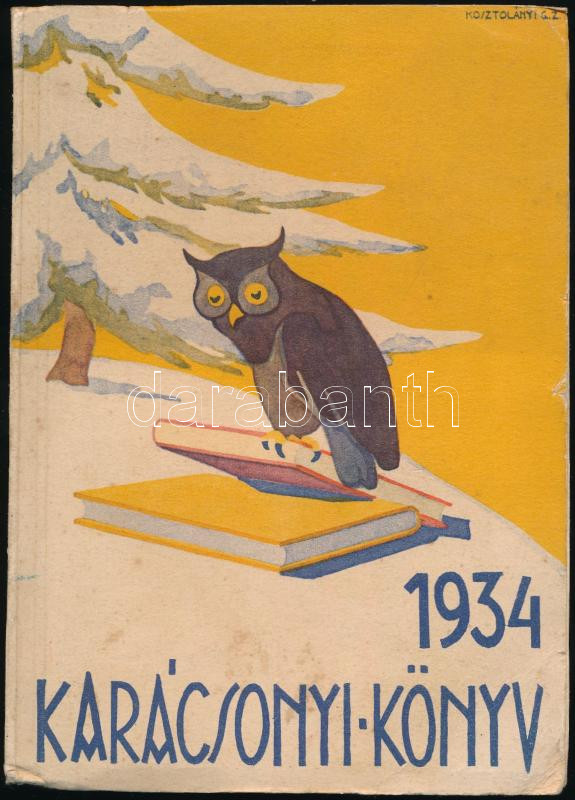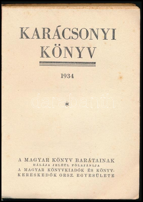 Karácsonyi könyv 1934. A magyar könyv barátainak hálája jeléül fölajánlja a Magyar Könyvkiadók és Könyvkereskedők Országos Egyesülete. Bp., 1934, Magyar Könyvkiadók és Könyvkereskedők Országos Egyesülete. Fekete-fehér képekkel illusztrálva. Kiadói illusztrált papírkötés, helyenként kissé foltos, felvágatlan lapokkal, több lap kijár.