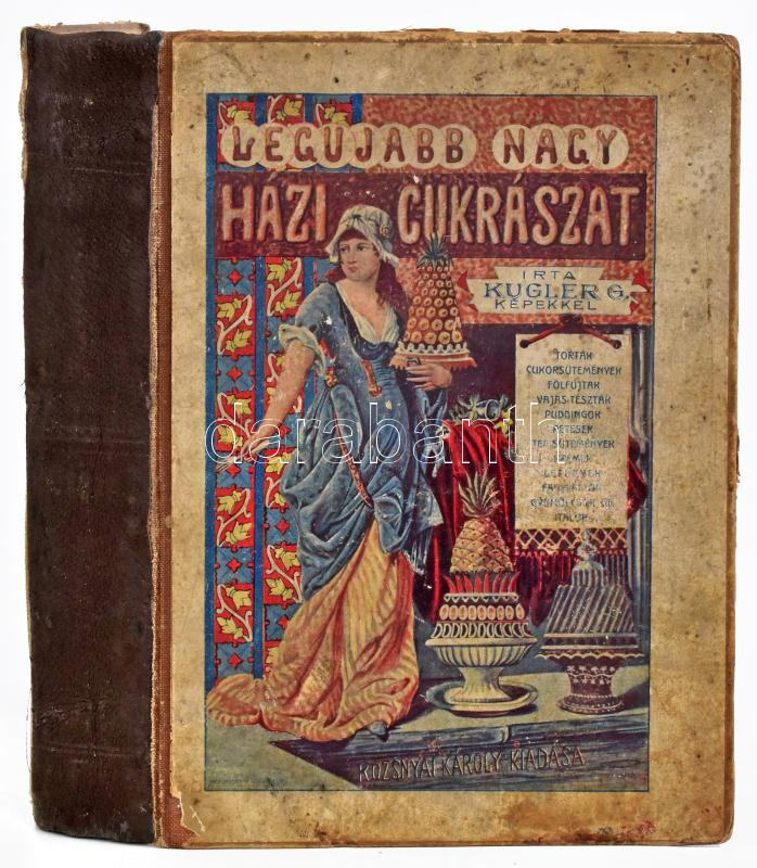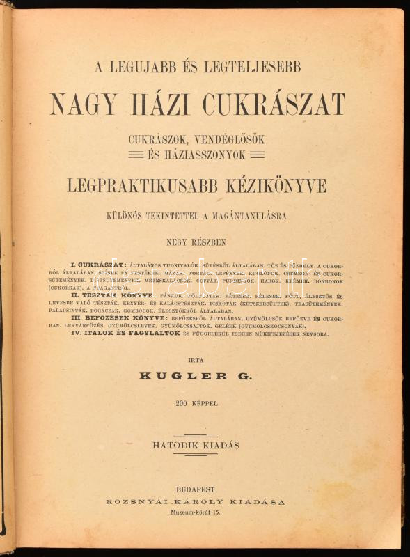 [Kugler Henrik (1830-1905)] Kugler Géza: A legujabb és legteljesebb nagy házi cukrászat. Cukrászok, vendéglősök és háziasszonyok legpraktikusabb kézikönyve, különös tekintettel a magántanulásra. Bp., [1905], Rozsnyai Károly, XIV+(2)+424 p.+18 p. (reklámok). Hatodik kiadás. Kiadói illusztrált félvászon-kötés, sérült, foltos borítóval, pótolt gerinccel, néhány foltos lappal.