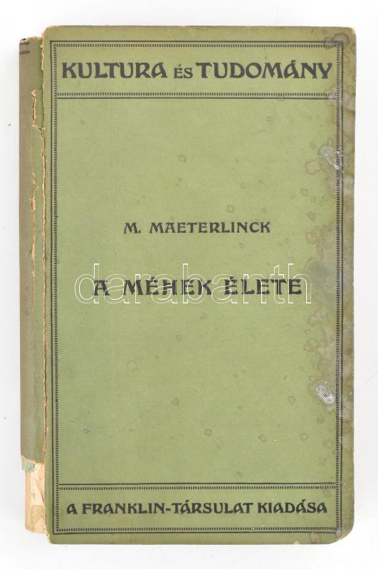Maurice Maeterlinck: A méhek élete. Ford.: Binder Jenő. Kultura és Tudomány. Bp., 1923, Franklin, 247 p. Kiadói keménykötés, kopott, foltos borítóval, sérült, részben hiányos gerinccel, de belül jó állapotban.