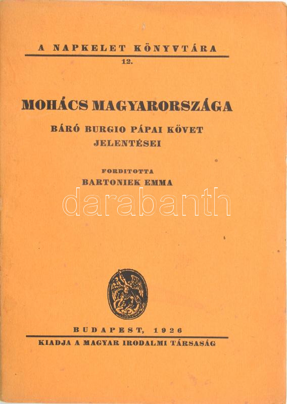 Bartoniek Emma: Mohács Magyarországa. Báró Burgio Pál követ jelentései. Napkelet Könyvtára 12. Bp., 1926., Magyar Irodalmi Társaság, 163+1 p. Kiadói papírkötés, kissé foltos gerinccel.
