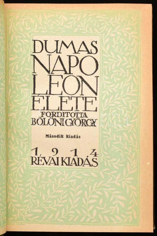 Dumas: Napoleon élete. Ford.: Bölöni György. Világkönyvtár. Bp., 1914, Révai. Második kiadás. A címlap és a kötés rajzát Zádor István készítette. Kiadói kemény-kötés, kissé kopott borítóval, a borítón hullámos borítással, kissé sérült gerinccel.
