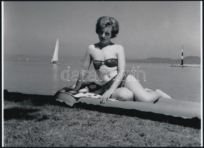 cca 1974 A Velencei-tónál napozó hölgy, pánt nélküli fürdőruciban, Sinka Antal (?-?) fényképész és fotóriporter hagyatékából 1 db modern nagyítás, jelzés nélkül, 15x21 cm