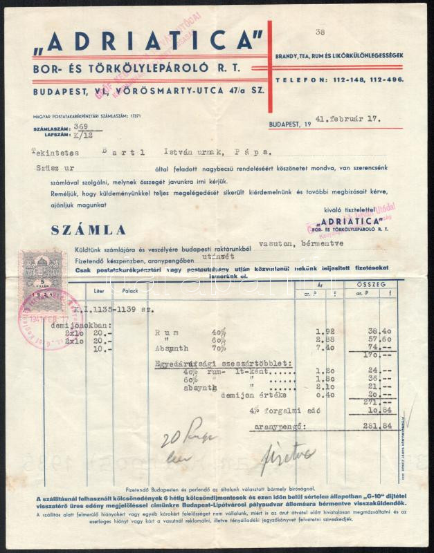 1941 "Adriatica" Bor- és Törkölylepárló R.T. fejléces számla https://www.darabanth.com/de/456-Fernauktion/456.0/Kunst-Dokumente-andere-Sammelgebiete/Dokument~500020/1941-Adriatica-Bor-es-Torkolyleparlo-RT-fejleces-szamla~II3048234