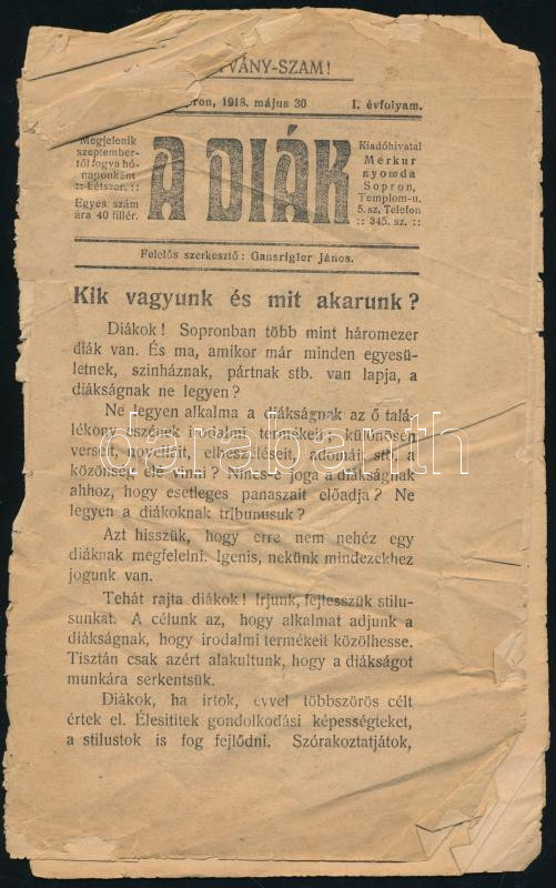 1918 A Diák I. évfolyamának 1. száma, rossz állapotban https://www.darabanth.com/de/456-Fernauktion/456.0/Kunst-Dokumente-andere-Sammelgebiete/Drucksachen~1000012/1918-A-Diak-I-evfolyamanak-1-szama-rossz-allapotban~II3048233