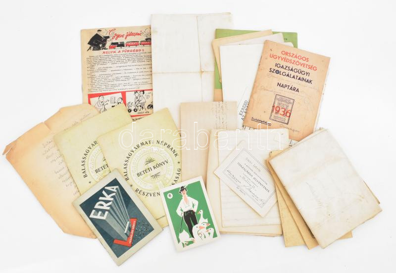 Beschreibung: cca 1930-1970 Vegyes nyomtatvány tétel (Diafilm árjegyzék, Országos Ügyvédszövetség naptára, Játékbolt reklámlap, stb.)