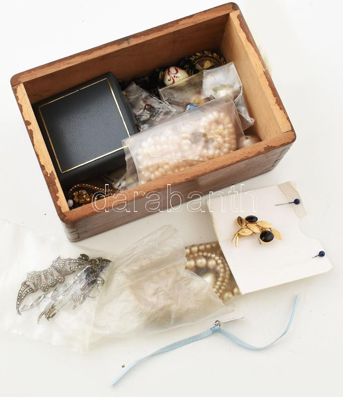 Beschreibung: Vegyes bizsu ékszer tétel szebb darabokkal, gránátköves, markazitos, stb fa ládikában