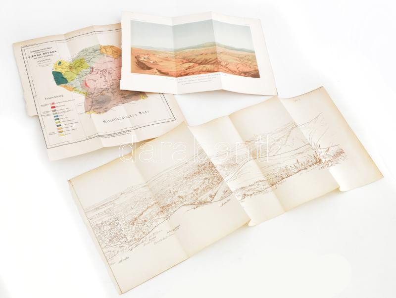 1879 Dr. Richard v. Drasche: Geologischen Karten-Skizze des Hochgebirgtheiles der Sierra Nevada und Seiner Umgebung / A Sierra Nevada hegylánc (Andalúzia, Spanyolország) térképe, 35,5x31 cm + egy monokróm, illetve egy színes panorámakép (össz. 3 db). In: Jahrbuch der k. k. Geologischen Reichsanstalt 1879, 29. Bd. Változó méretben és állapotban.