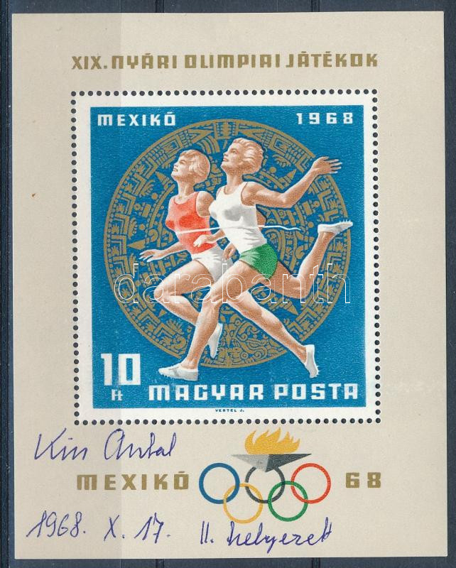 Beschreibung: 1968 Olimpia (III.) blokk Kiss Antal olimpiai ezüstérmes gyalogló aláírásával