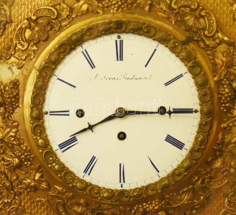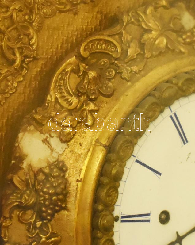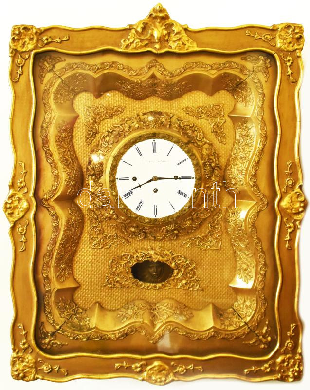 Keretóra. Negyedütős szerkezettel, zománcozott, számlappal, kopott készítői jelzéssel. betétekkel. Francia, XIX .sz. közepe. Működik, kulcs nélkül, néhol kisebb hibákkal. 60x55 cm