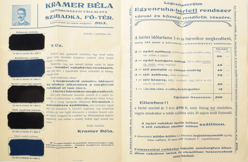 cca 1910 Szabadka, Kramer Béla egyenruha vállalata reklám nyomtatvány,... https://www.darabanth.com/de/456-Fernauktion/456.0/Kunst-Dokumente-andere-Sammelgebiete/Werbungen~1000036/cca-1910-Szabadka-Kramer-Bela-egyenruha-vallalata-reklam-nyomtatvany-termek-mintakkal-4-p~II3044005