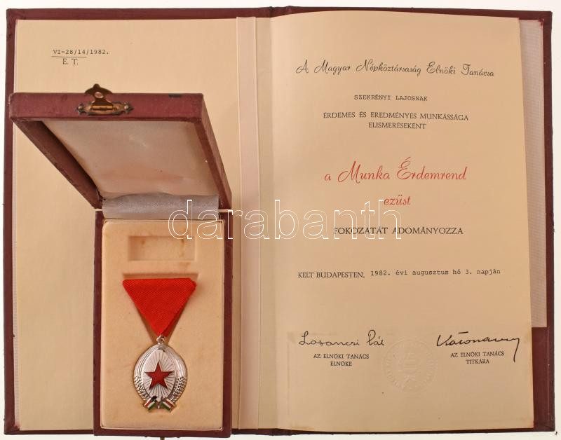 1982. "Munka Érdemrend ezüst fokozata", zománcozott, ezüstözött bronz ... https://www.darabanth.com/de/456-Fernauktion/456.0/Numismatik/Faleristik-Auszeichnungen-Medaillen-Orden~2000020/1982-Munka-Erdemrend-ezust-fokozata-zomancozott-ezustozott-bronz-kituntetes-mellszalagon~II3044230