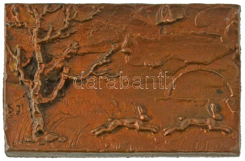 Beschreibung: DN Mezőn vágtázó nyulakat ábrázoló egyoldalas bronz plakett. Szign.: SJ (71x108mm) T:AU