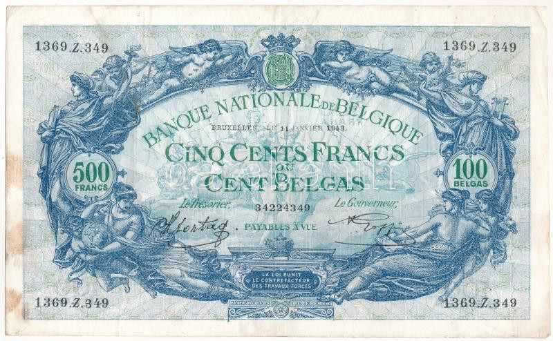 Beschreibung: Belgium 1943. 500Fr T:F folt