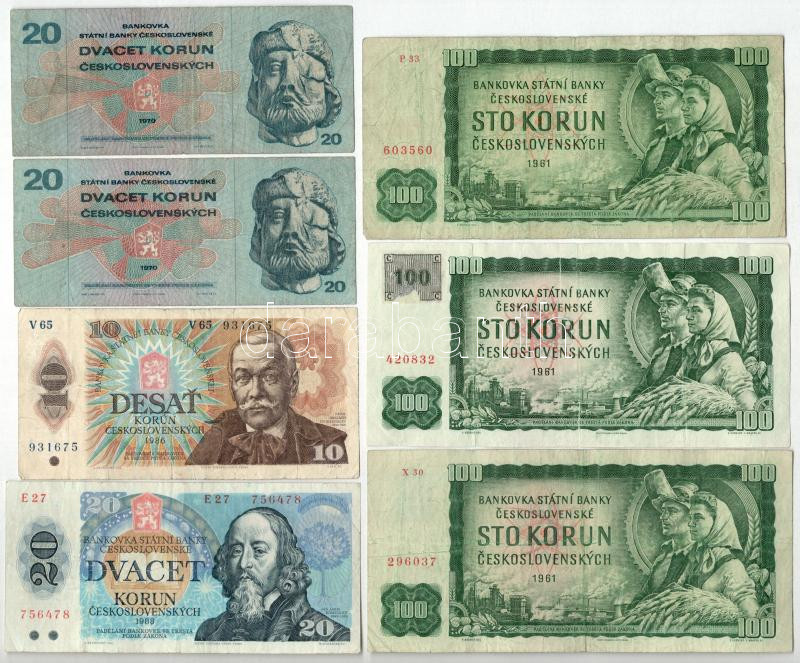 Csehszlovákia 1961. 100K (3x) az egyik szlovák bélyeggel + 1970. 20K (... https://www.darabanth.com/de/456-Fernauktion/456.0/Numismatik/Weltweit-Banknoten~2000015/Csehszlovakia-1961-100K-3x-az-egyik-szlovak-belyeggel-plus-1970-20K-2x-plus-1986-10K-plus-1988-20K~II3044758