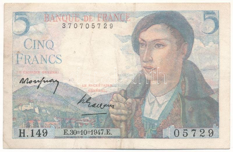 France 1947. 5 F... https://www.darabanth.com/de/456-Fernauktion/456.0/Numismatik/Weltweit-Banknoten~2000015/Franciaorszag-1947-5Fr-H149-05729-T-F-szep-papirFrance-1947-5-Francs-H149-05729-C-F-fine~II3040482