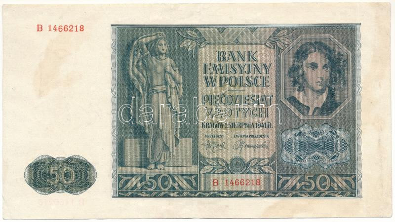 ... https://www.darabanth.com/de/456-Fernauktion/456.0/Numismatik/Weltweit-Banknoten~2000015/Lengyelorszag-Nemet-megszallas-1941-50Zl-B-T-F-folt-eros-papirPoland-German-Occupation~II3044519