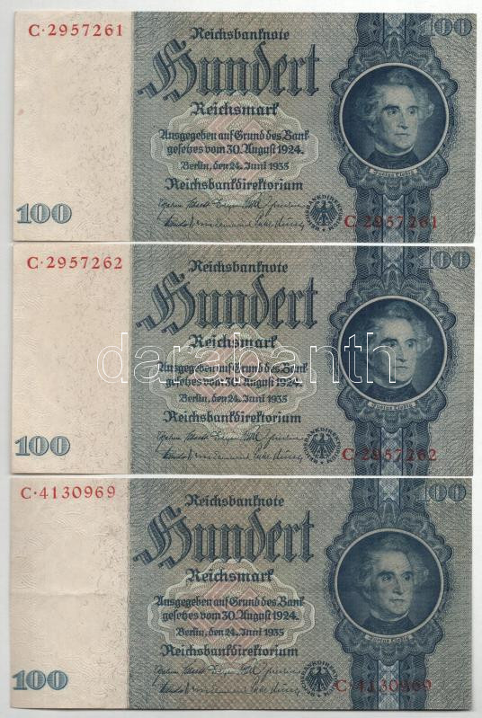 Német Harmadik Birodalom 1935. 100M (3db, ebből 2db sorszámkövető) T:XF,VF German Third Reich 1935. 100 Mark (3pcs, within 2pcs consecutive serials) C:XF,VF Krause P#183