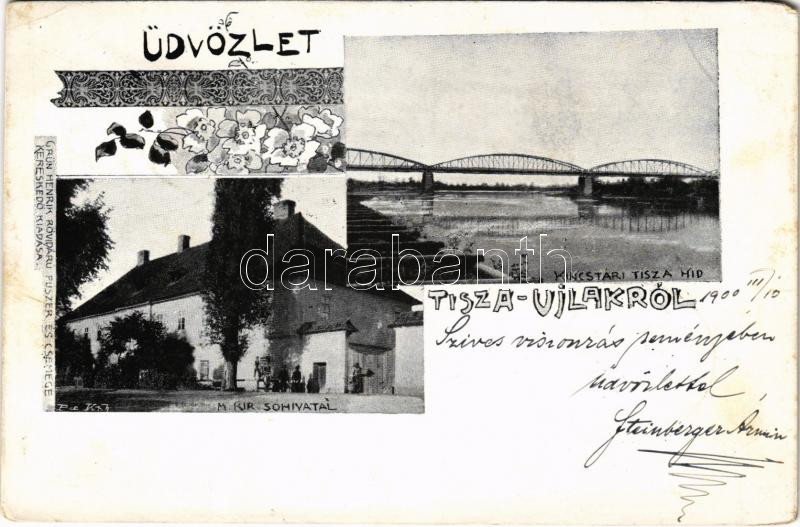 1900 Tiszaújlak, Vulok, Vilok, Vylok; Kincstári Tisza híd, M. kir. sóhivatal. Grün Henrik kiadása / Tisa bridge, salt mine office. Art Nouveau, floral (EK)