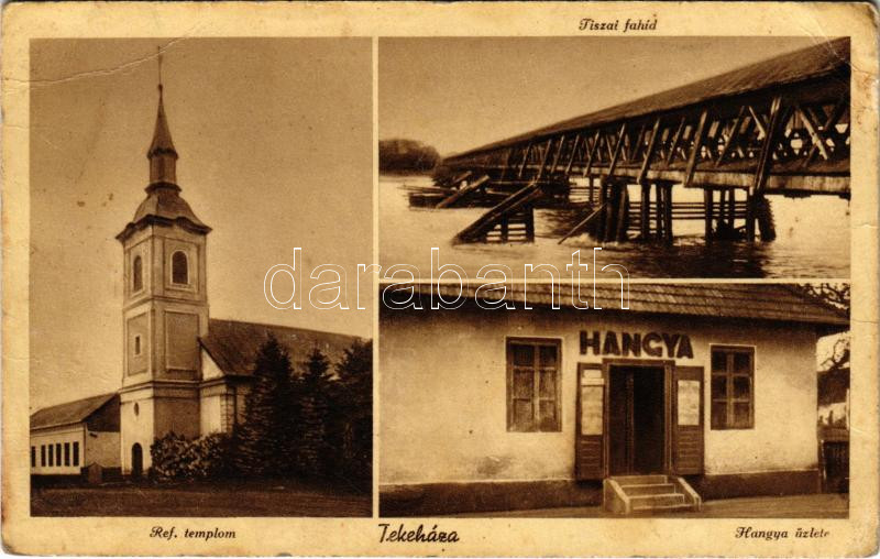 Beschreibung: 1945 Tekeháza, Tekovo, Tekove; Református templom, Tiszai fahíd, Hangya szövetkezet üzlete és saját kiadása / Calvinist church, Tisa wooden bridge, cooperative shop (EB)