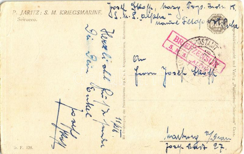 Beschreibung: Scirocco: S.M. (K.u.k) Kriegsmarine Seeflugzeuge P.U.G. Nr. F. 128. / Austro-Hungarian navy postacard, seaplane, hydroplane s: P. Jaritz + "BRIEFZENSUR S.M.S. "ALPHA" (EB)