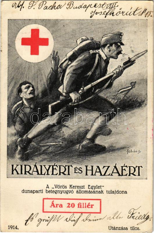 1915 Királyért és Hazáért! A Vörös Kereszt Egylet dunaparti betegnyugvó állomásának tulajdona / WWI Austro-Hungarian K.u.K. military art postcard, Red Cross propaganda, support fund s: Földes (Rb)