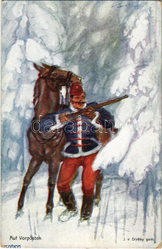 Auf Vorposten. Offizielle Karte für Rotes Kreuz, Kriegsfürsorgeamt Kriegshilfsbüro Nr. 367. / WWI Austro-Hungarian K.u.K. military art postcard, hussar outpost, support fund s: J. v. Divéky (EK)