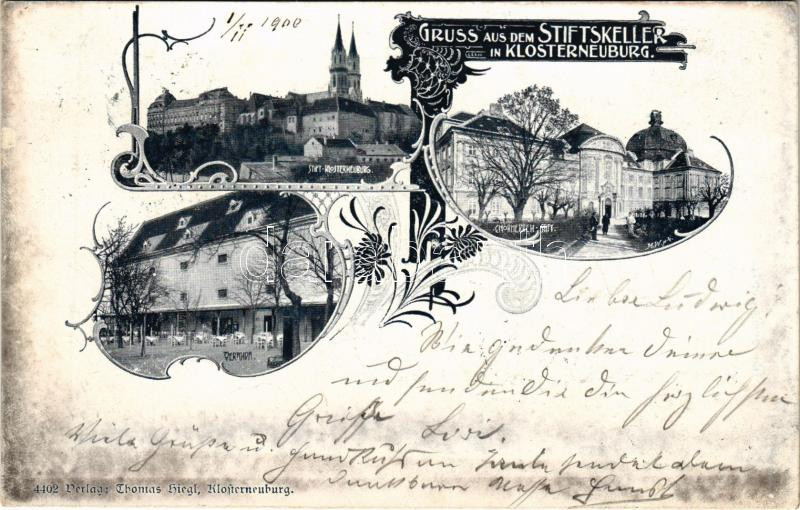 1900 Klosterneuburg. Gruss aus dem Stiftskeller, Chorherren, Veranda. ... https://www.darabanth.com/de/457-Fernauktion/457.0/Ansichtskarten/Osterreich~1000062/1900-Klosterneuburg-Gruss-aus-dem-Stiftskeller-Chorherren-Veranda-Thomas-Hiegl-restaurant-Art~II3056908