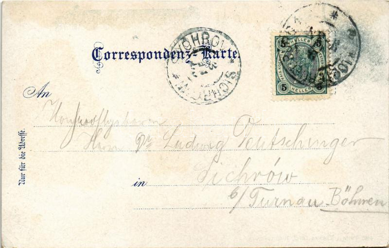 Beschreibung: 1900 Klosterneuburg. Gruss aus dem Stiftskeller, Chorherren, Veranda. Thomas Hiegl / restaurant. Art Nouveau, floral (EK)
