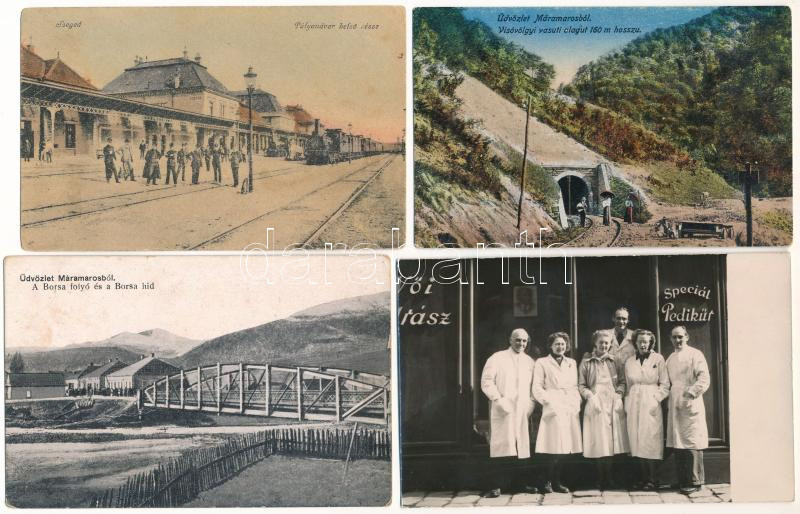 4 db RÉGI képeslap vegyes minőségben: Máramaros Borsa, Visóvölgyi vasúti alagút, Szeged vasútállomás, budapesti női fodrász üzlet fotója / 4 pre-1945 postcards in mixed quality