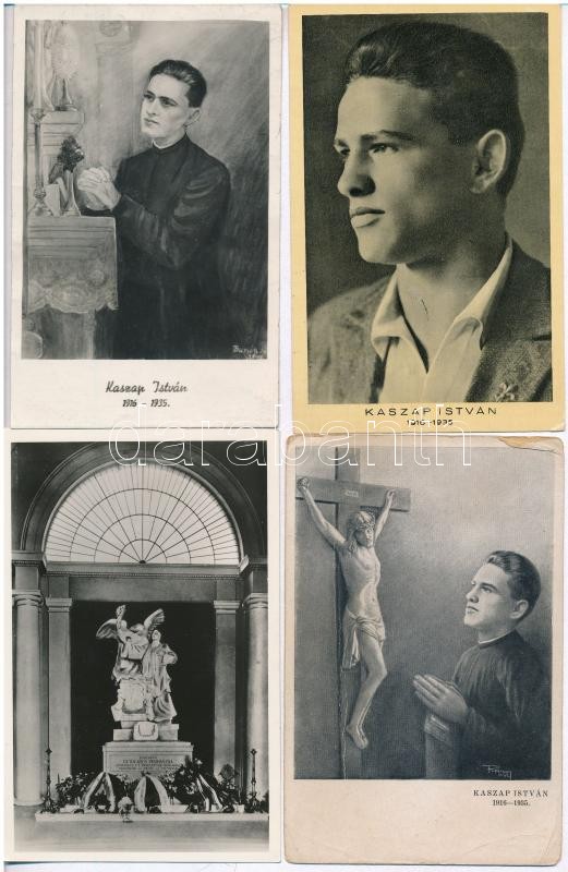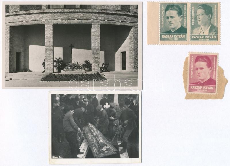Kaszap István-tétel: 5 db régi képeslap róla és a sírjáról a székesfehérvári Prohászka Ottokár templom mellett, 1 fotó az exhumálásáról, 3 bélyeg / 5 pre-1945 postcards, 1 photo, 3 stamps of Kaszap István, Hungarian jesuit novice