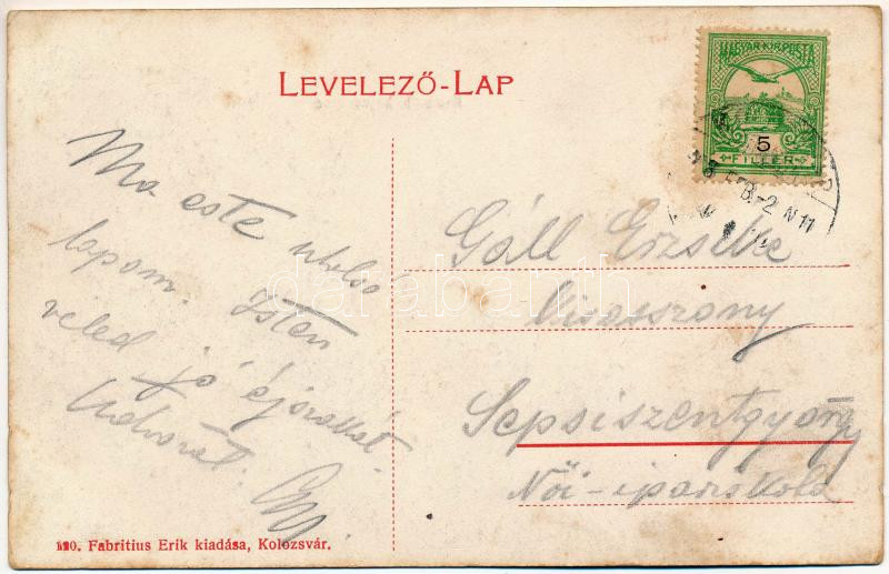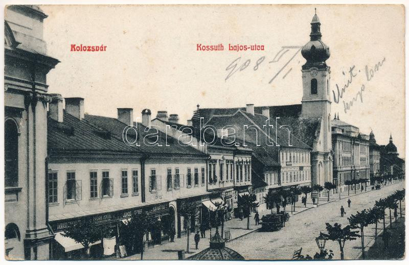 1908 Kolozsvár, Cluj; Kossuth Lajos utca, Fodor Antal, Juhos József, Kun Mátyás üzlete, templom. Fabritius Erik kiadása / street view, shops, church (fl)