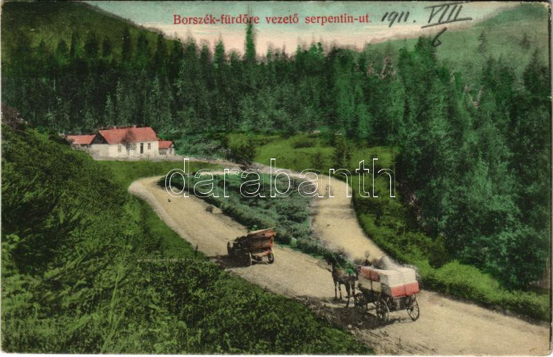1911 Borszék-fürdő, Baile Borsec; Serpentin út autóval és lovas kocsiv... https://www.darabanth.com/de/457-Fernauktion/457.0/Ansichtskarten/Siebenburgen~1000006/1911-Borszek-furdo-Baile-Borsec-Serpentin-ut-autoval-es-lovas-kocsival-road-with-automobi~II3054684