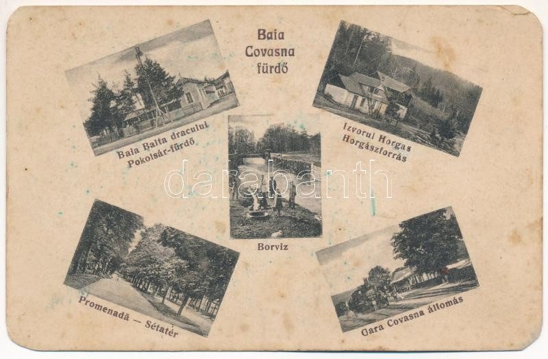 1922 Kovásznafürdő, Baile Covasna; Sétatér, Pokolsár fürdő, Borviz, Hogászforrás, vasútállomás. Kiadja Hadnagy-féle bazár / Promenada, Baia Balta dracului, Izvorul Horgas, Gara / promenade, spa, bath, spring source, railway station (EM)