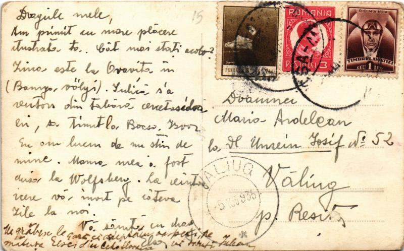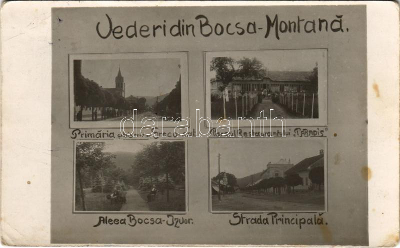 1935 Boksánbánya, Románbogsán, Németbogsán, Deutsch-Bogsan, Bocsa Montana; Primaria si biserica Greco-cat., Parcul Restaurantului "Paradis", Aleea Bocsa-Izvor, Strada Principala / Városháza, Görögkatolikus templom, "Paradis" park étterem, sétány, Fő utca / town hall, Greek Catholic church, park restaurant, promenade, main street. photo (EB)