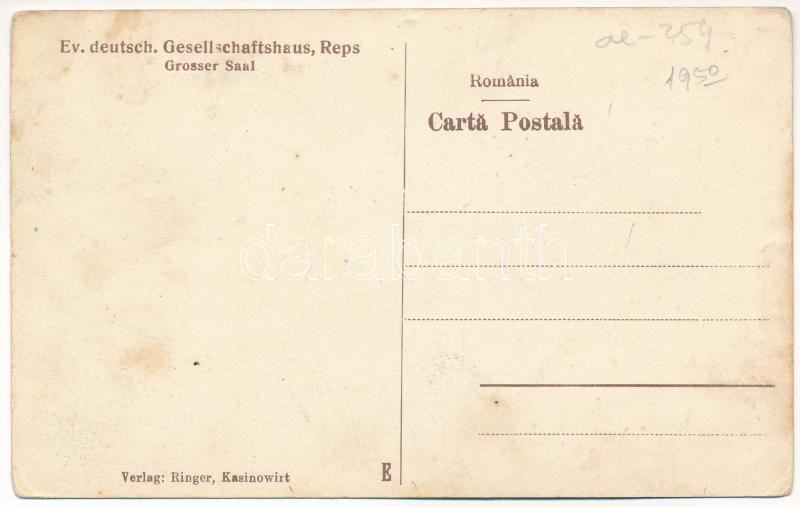 Kőhalom, Reps, Rupea; Ev. deutsch. Gesellschaftshaus, Grosser Saal / Német evangélikus társasági ház belső, nagy étkező terem / German Lutheran Sociaty house interior, great hall (fl)