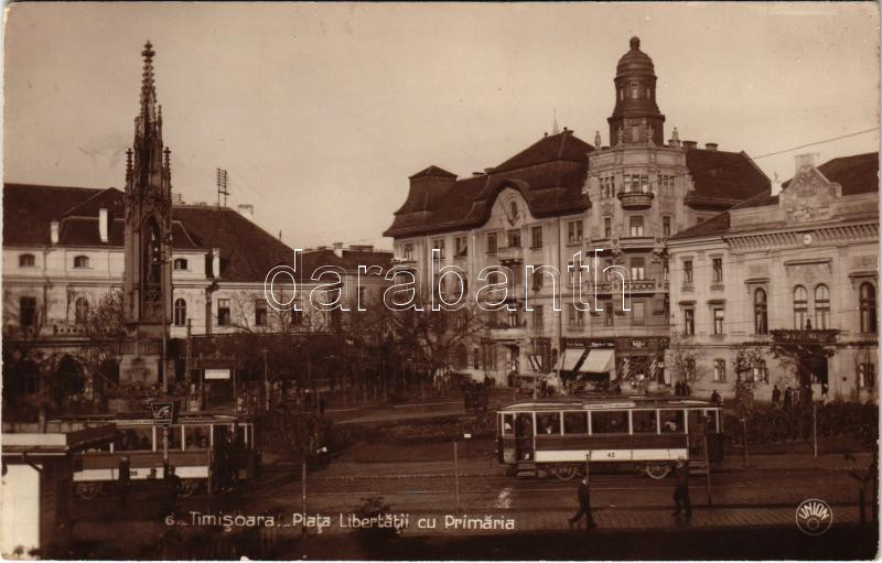 Temesvár, Timisoara; Piata Libertatii cu Primaria / Rukavina emlékmű, Fő tér, villamosok, Lang üzlete, étterem. Bela Galambos kiadása / square, monument, shops, restaurant, trams