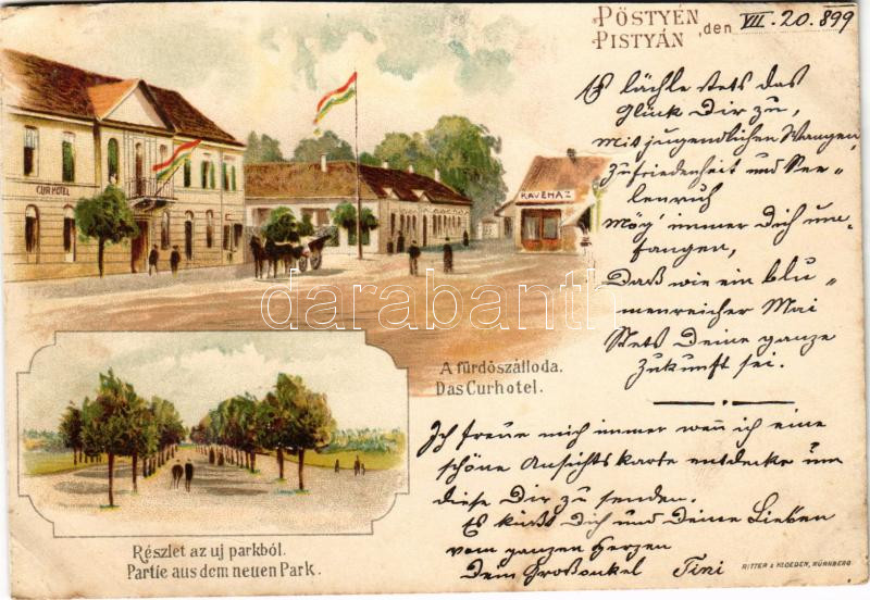 Beschreibung: 1899 (Vorläufer) Pöstyén, Pistyan, Piestany; Fürdő szálloda, kávéház / részlet az új parkból / spa, hotel, café, new park. Ritter & Kloeden Art Nouveau litho (vágott / cut)