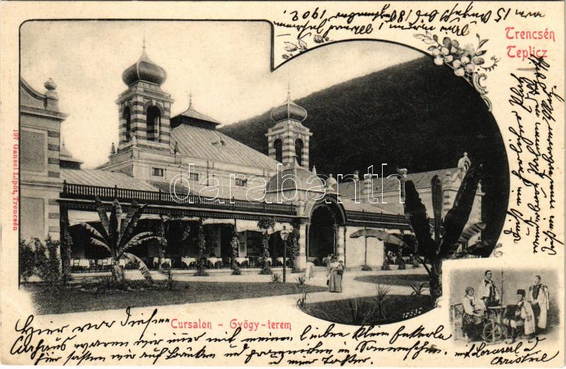 Beschreibung: 1902 Trencsénteplic, Trencianske Teplice; Cursalon / Gyógyterem. Gansel Lipót kiadása / spa, bath, folklore. Art Nouveau, floral (EK)