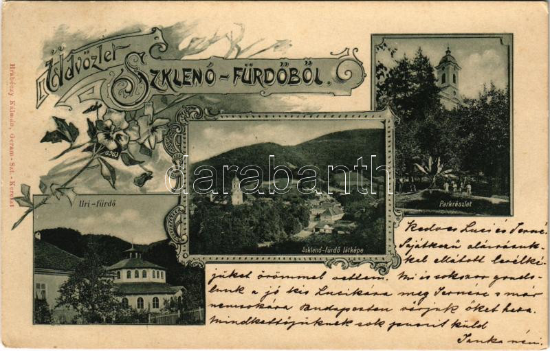 Beschreibung: Szklenófürdő, Sklené Teplice; Úri fürdő, látkép, park. Hrabéczy Kálmán kiadása / spa, bath, general view, park. Art Nouveau, floral