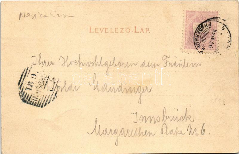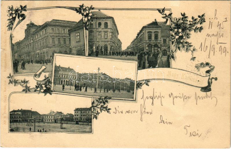 Beschreibung: 1899 (Vorläufer) Nagykanizsa, Városháza, Csengeri utca, Deák tér, Fő tér. Alt és Böhm kiadása Art Nouveau, floral (EK)