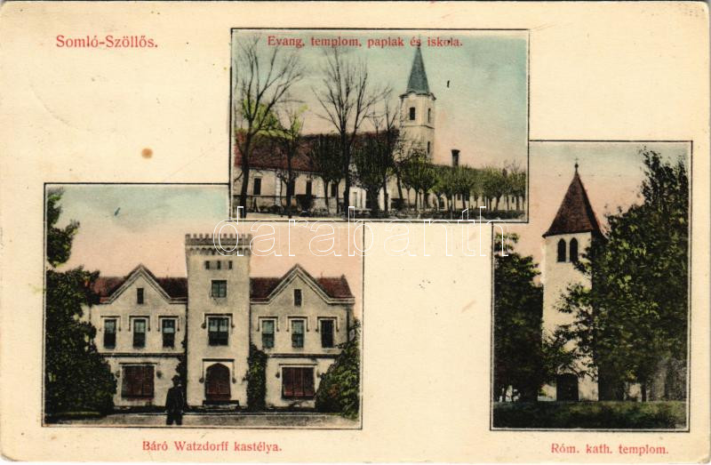 Beschreibung: 1911 Somlószőlős, Somlószőllős; Evangélikus templom, paplak és iskola, Római katolikus templom, Báró Watzdorff kastélya (EK)