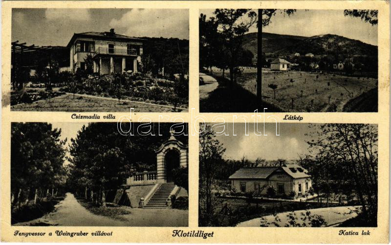 1937 Klotildliget (Piliscsaba), Csizmadia villa, látkép, Fenyvessor a ... https://www.darabanth.com/de/457-Fernauktion/457.0/Ansichtskarten/Ungarn~1000005/1937-Klotildliget-Piliscsaba-Csizmadia-villa-latkep-Fenyvessor-a-Weingruber-villaval-Katica~II3053475