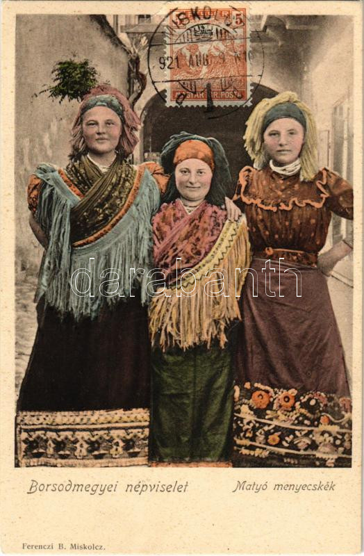 Borsod megyei népviselet, Matyó menyecskék. Ferenczi B. (Miskolc) kiad... https://www.darabanth.com/de/457-Fernauktion/457.0/Ansichtskarten/Ungarn~1000005/Borsod-megyei-nepviselet-Matyo-menyecskek-Ferenczi-B-Miskolc-kiadasa-fa~II3052371