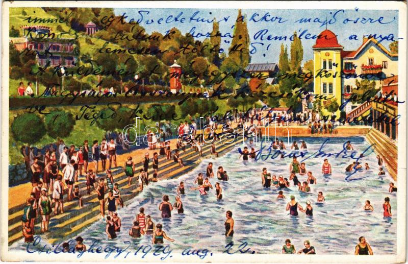 Beschreibung: Budapest III. Csillaghegyi Árpád fürdő, strand, park, sétány, szálloda és étterem, hátoldalon reklám. Löbl D. és fia kiadása (EK)