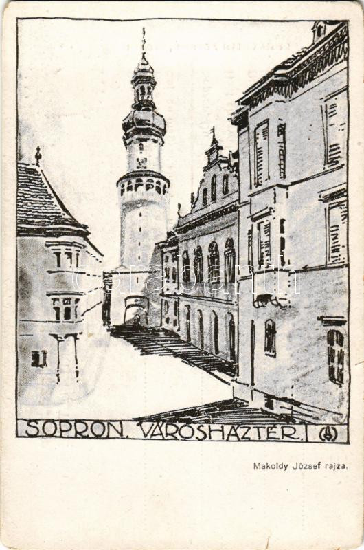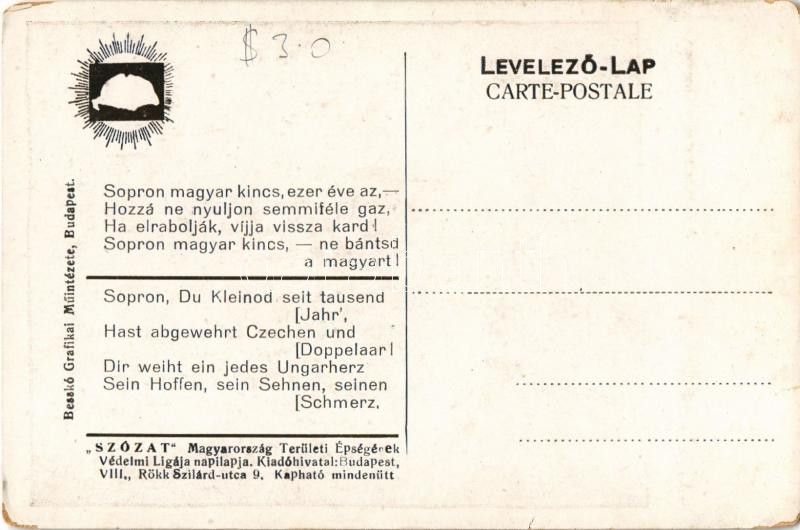 Sopron, Városház tér. Hátoldalon irredenta szöveg. Szózat Magyarország Területi Épségéért Védelmi Ligája napilap kiadása s: Makoldy József (kis szakadás / small tear)