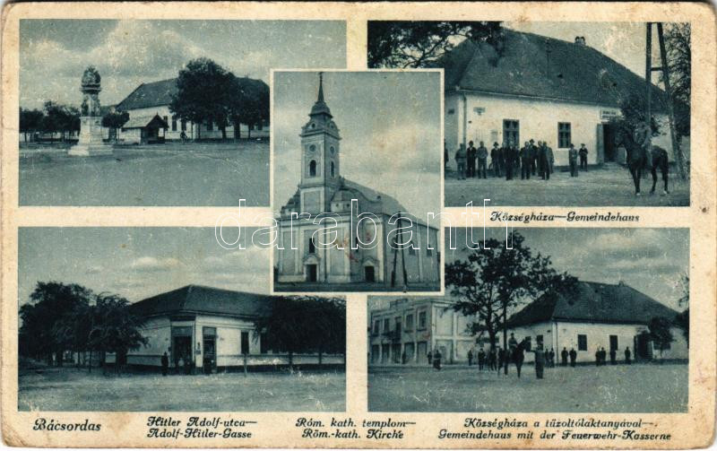 Bácsordas, Karavukova, Karavukovo; Községháza, Hitler Adolf utca, Római katolikus templom, Tűzoltólaktanya / town hall, street, church, fire station (Rb)
